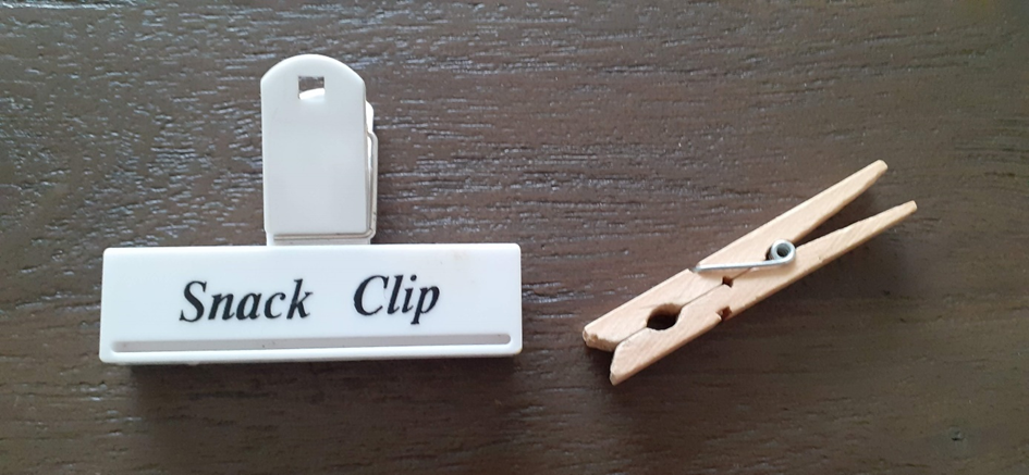 Een gewone houten, simpele wasknijper en een moderne versie. Zodanig aangepast dat de functie er blijkbaar voor de duidelijkheid wel op moet staan. Terwijl dat met een knijper vrij logisch is en ook geen verdere uitleg nodig heeft.
